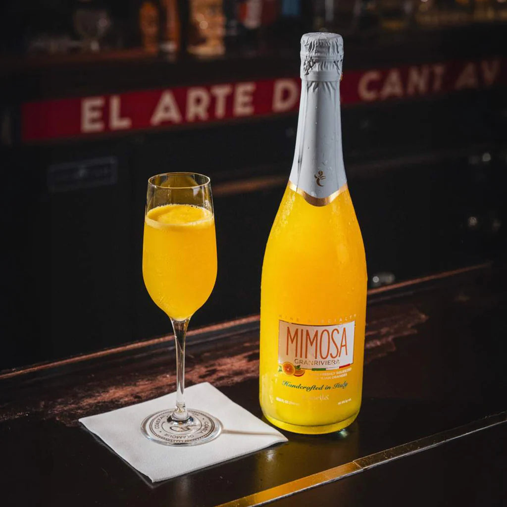 Una Mimosa lista para beber de alta calidad, hecha con vino espumoso italiano, 31/2 naranjas sicilianas y un toque de bergamota.